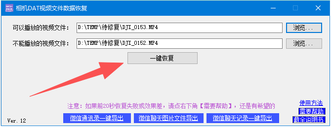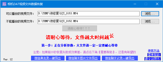 三、软件打开后,使用方法很简单,只有两个格子需要填,按格子中的红字的指导来选择即可,第一个格子要选择可以播放的视频,第二个格子选择那个坏的文件