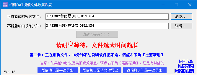 七、第二步是解析损坏的那个文件,这一步花的时间视文件大小而定,如果文件小,就快,文件大的就慢,如果文件太大,15分钟都进不了第三步,那就说明修不了了,点击软件右下角【需要帮助】联系人工修复吧。
