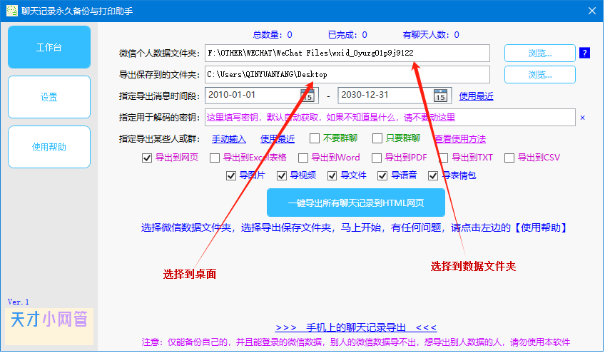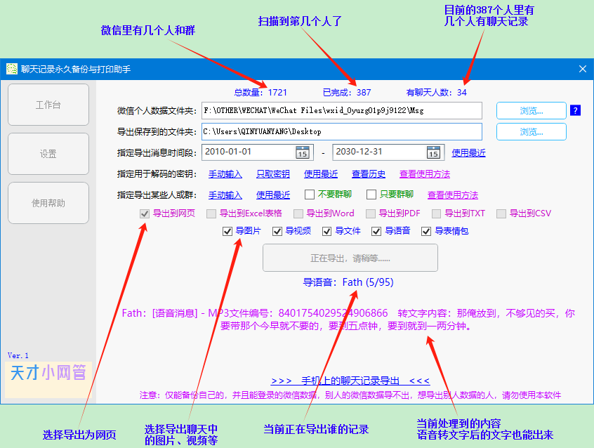 十六、注意:界面中还有一些功能,功能的作用就如同功能的名字一样,自己按需要勾选,比如时间选择、指定导出某个人、不导出群聊、离线导出功能等