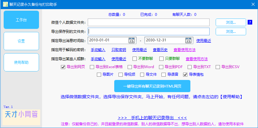 本文章主要解决的就是聊天记录数据永久备份的问题,需要使用【聊天记录永久备份与打印助手】这个软件来进行备份,软件使用不难,不过前提是微信一定要能登录才可以,如果登录不了,本教程也就失效了。