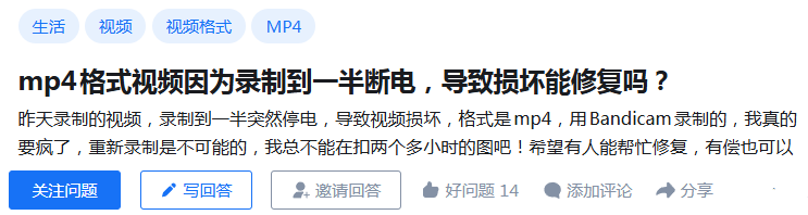 先看以下知乎中的问题,这类问题,每天都在发生,无处不在,要么录屏断电、或者突然硬盘空间满了,或者相机断电等问题,都有可能导致视频损坏播放不了。