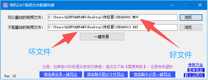 3,软件打开后,界面上有两个需要选择文件的格子,第一个选一个好文件,第二个选择需要修复的坏文件,好的文件需要一个同设备同参数同时段拍的正常可以播放的视频,一共需要一好一坏两个文件。