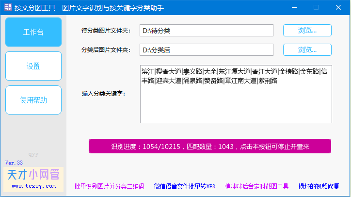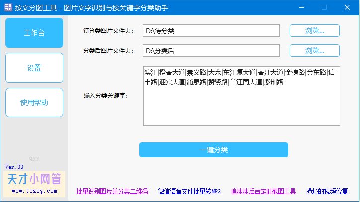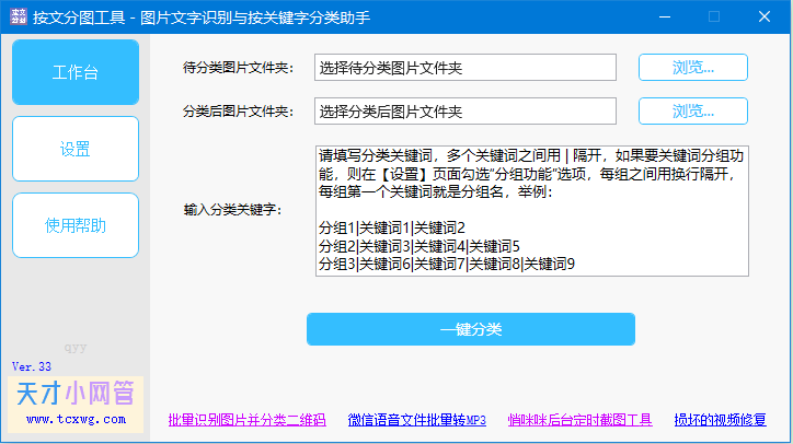 软件打开后,可以看到需要选择和设置待分类文件夹、分类后文件夹、关键字,这3项内容