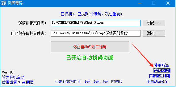 点击【开始自动识别二维码】,软件就会自动检测微信里收到的图片了。