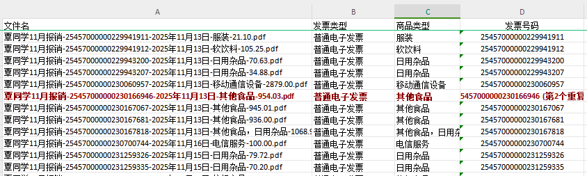表格数据:所有发票的关键信息,如发票号码、开票日期、买卖方信息、金额、税额等,都已整齐地汇总在表格中。重复的发票会被标红提示。
