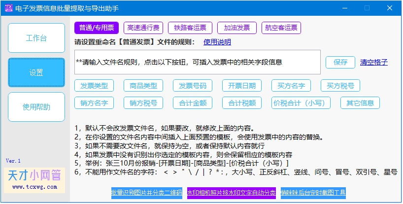 软件将用发票的实际内容替换这些变量,生成新文件名。