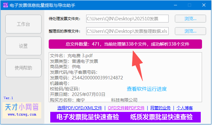 软件开始运行后,你可以在下方的信息框中看到实时处理进度,包括当前处理到第几个文件、成功解析数量等。处理速度非常快,471张发票大约在20-30秒内即可完成。