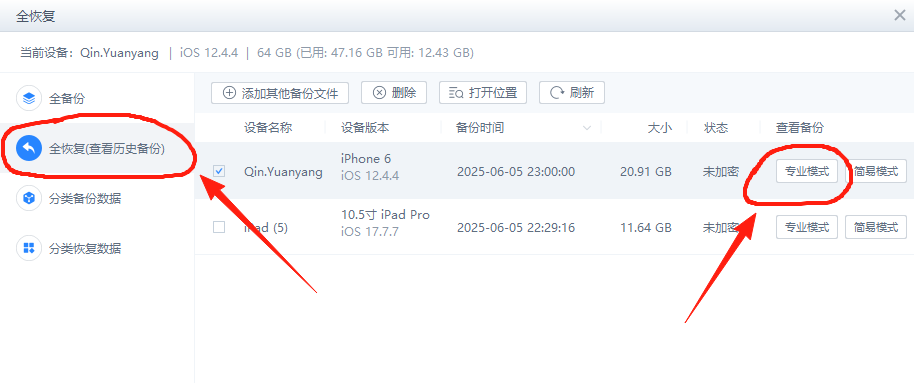 备份完成后,点击左侧的"查看历史备份",然后选择"专业模式"进入备份查看器。