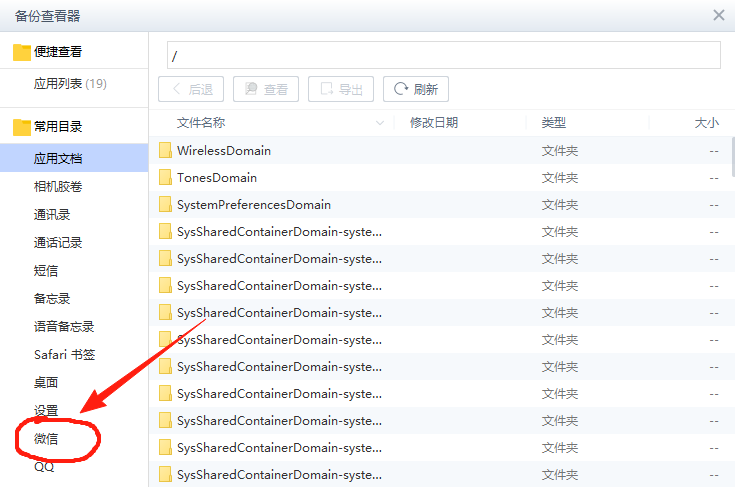 在备份查看器中找到"微信"分类,进入后可以看到Documents文件夹。
