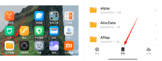 打开手机上的"文件管理"应用,切换到"手机"标签页。依次进入:Android → data → com.tencent.mm → MicroMsg。