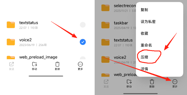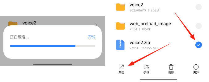 长按voice2文件夹,选择"更多"→"压缩",等待压缩完成。压缩过程可能需要十几分钟,请耐心等待。