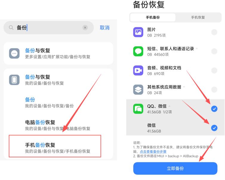 在备份与恢复页面,选择"手机备份恢复",然后只勾选微信数据选项,点击"立即备份"。